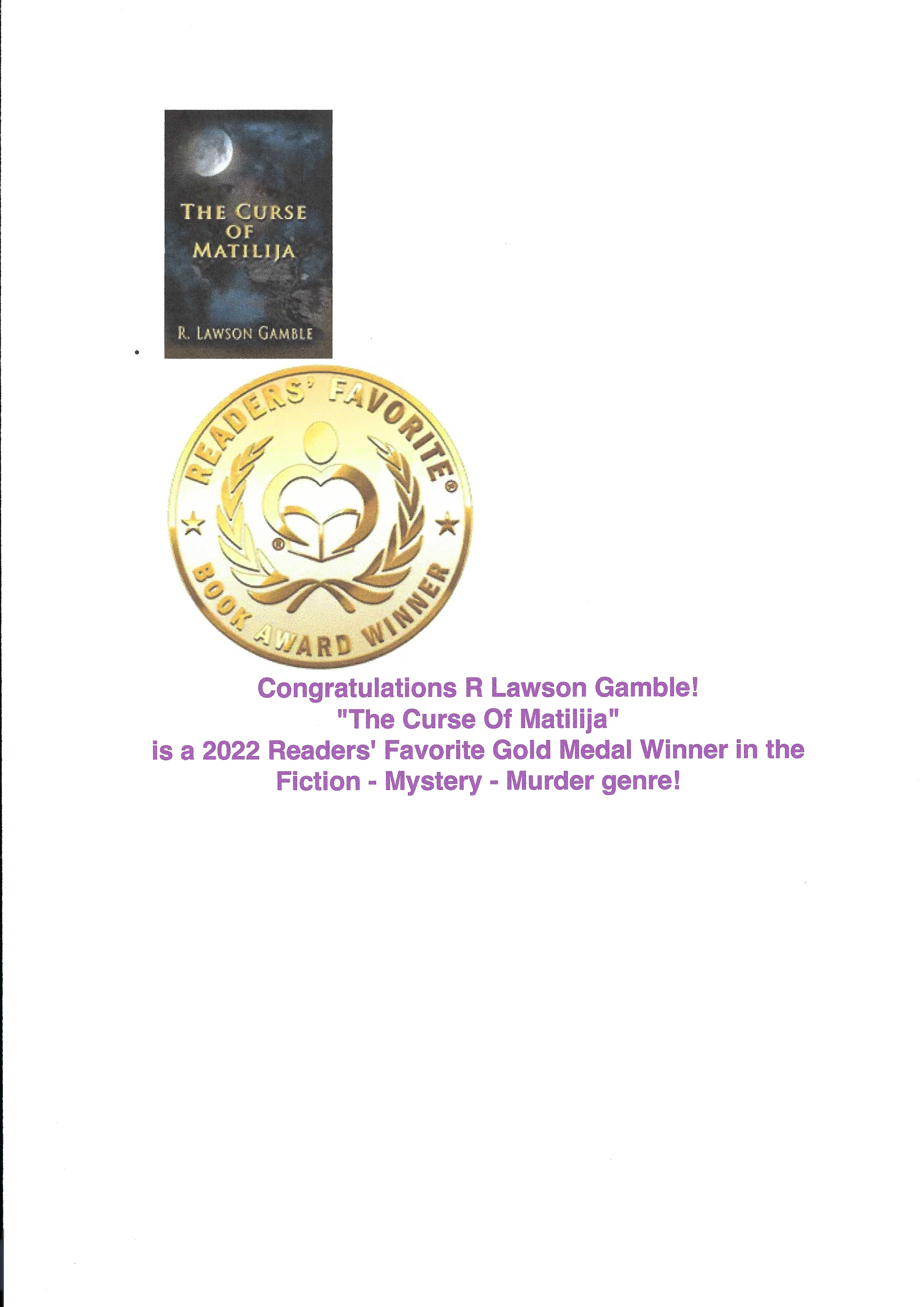 BOOK GIVE-AWAY: “THE CURSE OF MATILIJA”, Zack Tolliver #9, winner of Readers’ Favorite International Book Contest 2022 Gold Medal for Fiction/Mystery/Murder will be FREE on Amazon all day Tuesday November 15. Grab one!